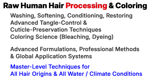 This program covers professional human hair processing and coloring, from raw hair preparation to bleaching, dyeing, correction, and finishing — based on decades of real-world manufacturing and training experience. |